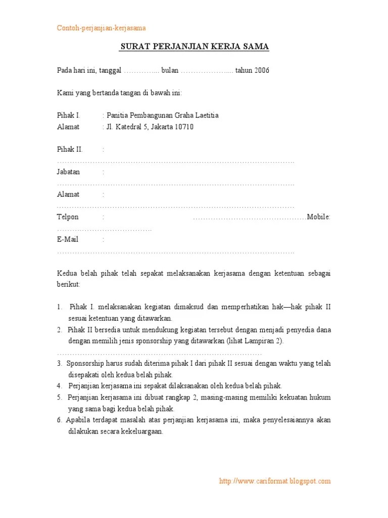 Bahan pakaian dinas dan atribut. Surat perjanjian kerjasama merupakan surat yang memiliki isi mengenai ketentuan khusus dari kesepakatan yang dilakukan oleh antar pebisnis. Untuk sasaran pangsa pasar seperti yang dimaksud pasal 3 surat perjanjian ini, pihak kedua memilih pasar indonesia selaku prioritas utama dan pihak pertama . Smartphone, yang selanjutnya disebut sebagai pihak pertama. Surat perjanjian kerjasama adalah surat yang berisi klausul atau kesepakatan atas perjanjian tertulis antara dua belah pihak atau lebih.